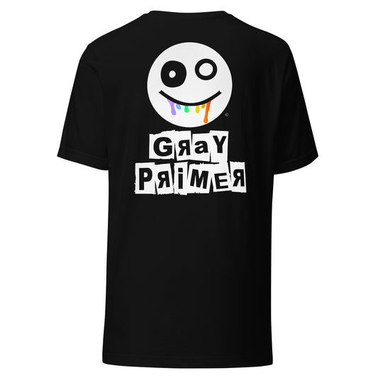 Subtle Front, Shouty Back - Gray Primer logo T-Shirt
